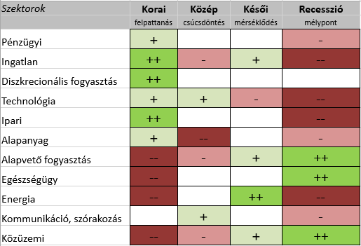 Jelmagyarázat: A halvány zöld, „+” jelölés azt jelenti, hogy az adott szektor az adott szakaszban jól teljesít. Az intenzív zöld,